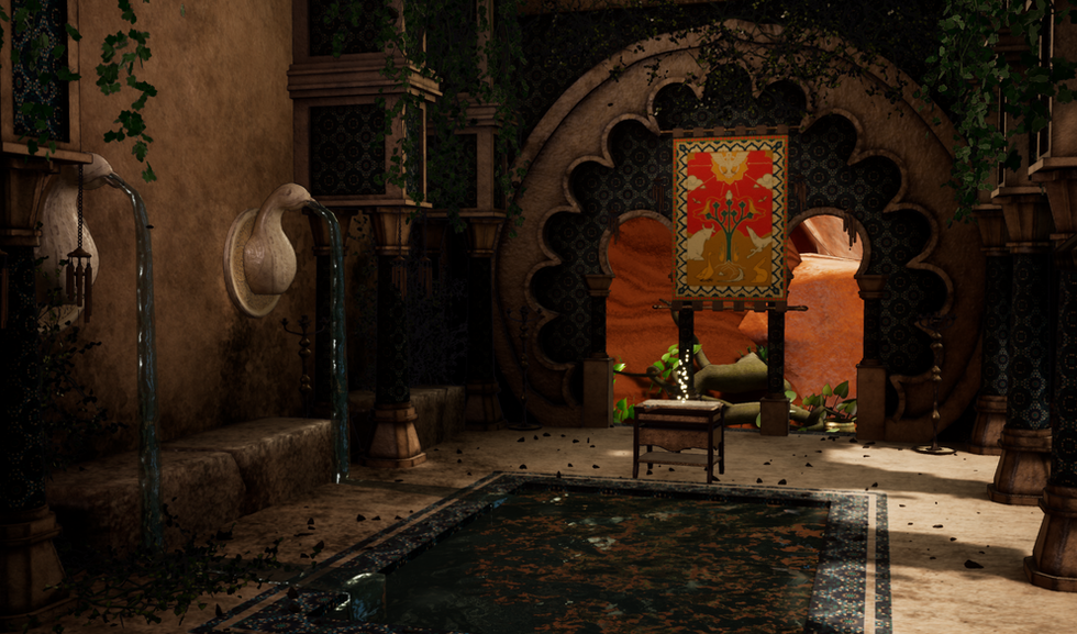 Leaving through a confined opening from the observatory, the player will first be greeted by outside world, as they descend a long and narrow walled path. But as they venture forward, they will experience a decompression, entering a sudden wide open space and focal vista of the game. The flooded temple area. There, the player will find a tranquil pool with many friendly birds, a small and heartfelt respite before the rest of the game ramps up drastically in tension.