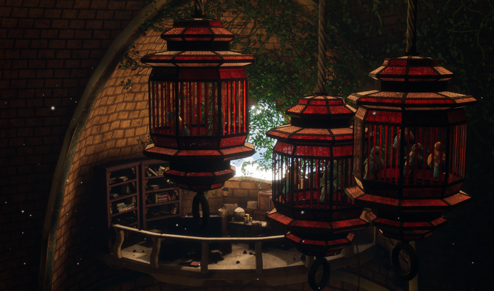 Up there, they will encounter many birds that were trapped in cages by Azhar. By freeing these non-shadowy birds they will help the player, by surrounding them, flocking together and giving the player immunity from light sources, as they provide shadow. Although the soaring light does affect these birds, they will still fly away one by one, if the flock is directly hit by the light. The player leaves the observatory through a small narrow tunnel in the center of the structure.