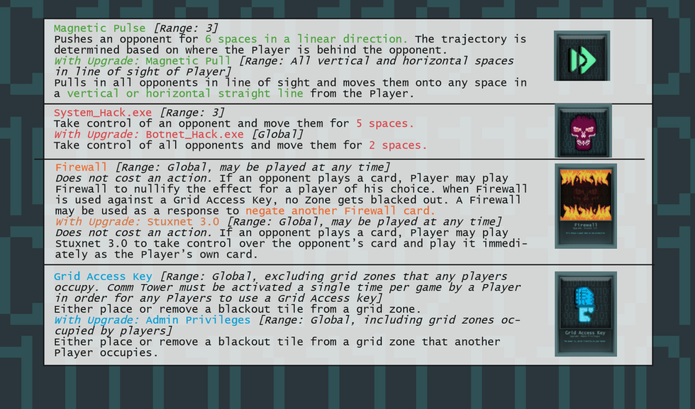 System Out was heavily influenced by the concept of "Everything is imbalanced, therefore all is balanced." Many board games we played tended to lean towards a zero-sum game principle, which is why we wanted our design to be more bold. System Out is a competitive free for all game, where your cards are used as single targeted ability, but through buffing it ingame or finding the right position on the board, the true devastation of a card could be unleashed, allowing one player to toy with multiple, if not all other players at once.